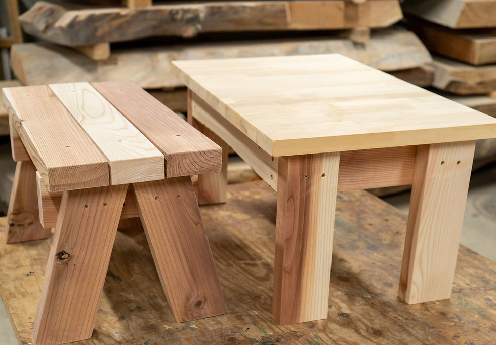 小菅村の杉材を使って、テーブルかベンチ、どちらかを選択して製作します。